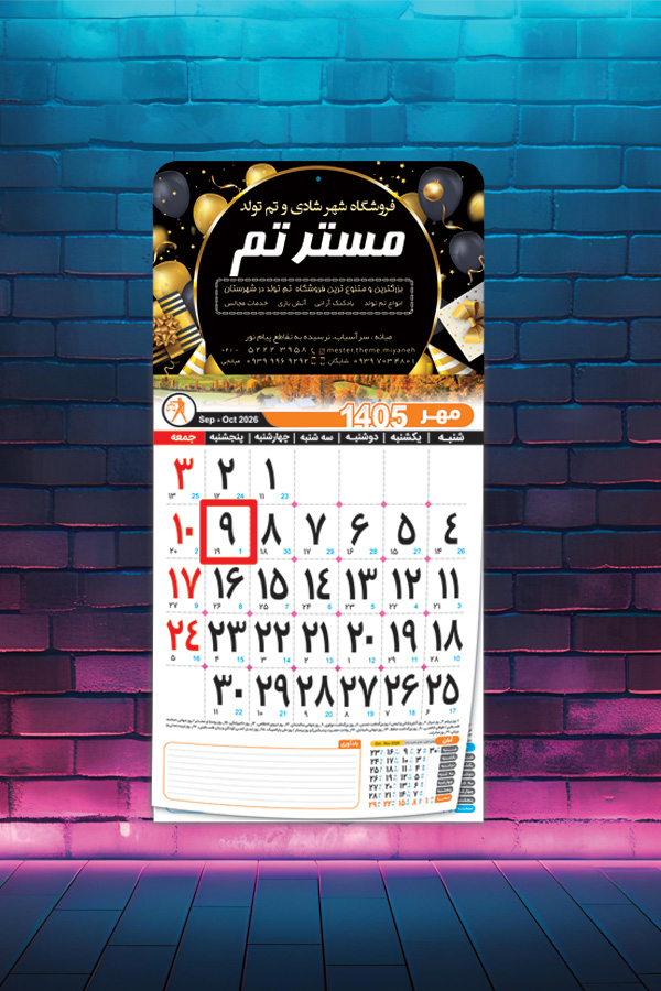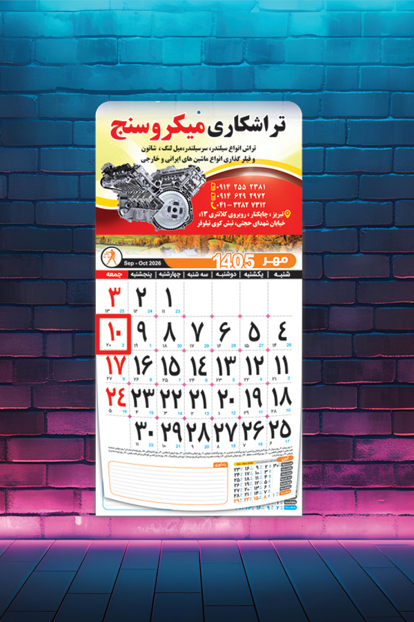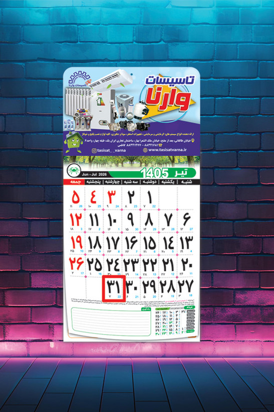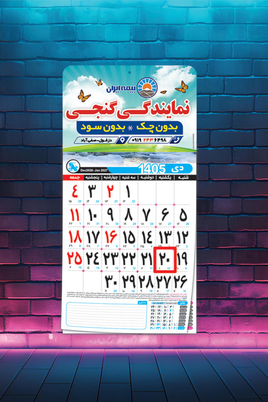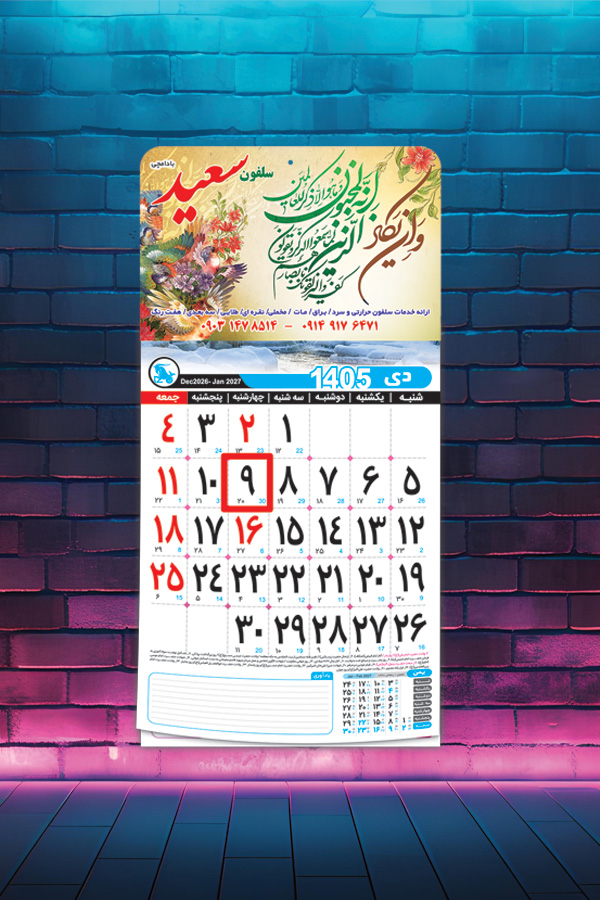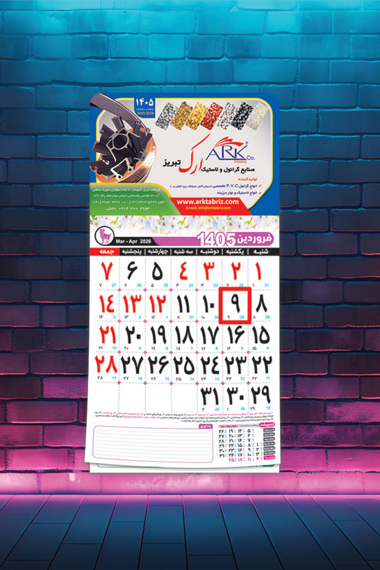 این تقویم نشاندار با هزینهای مناسب، بهترین گزینه برای معرفی برند شما در طول سال است و با طراحی اختصاصی، تبلیغات شما را به شکلی جذاب و ماندگار به مخاطبان منتقل میکند.